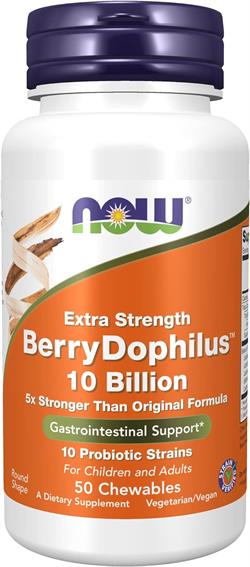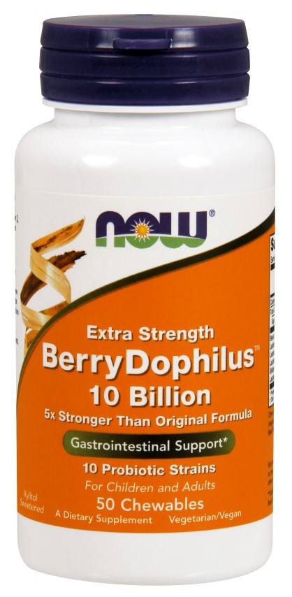 Product Description: NOW Extra Strength BerryDophilus provides 10 Billion CFU from a combination of 10 clinically validated probiotic bacterial strains designed to support gastrointestinal health and healthy immune system function.* Healthy intestinal flora also helps to create a favorable environment for the absorption of nutrients.* BerryDophilus can be used by both adults and children. Sweetened with Xylitol, BerryDophilus wont harm teeth and it tastes great. 10 Billion, 10 Probiotic Strains For Children and Adults Xylitol Sweetened A Dietary Supplement Vegetarian/Vegan.
