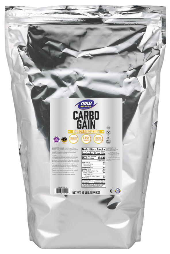 Product Description: NOW Carbo Gain is pure maltodextrin, a complex carbohydrate derived from corn. Maltodextrinis comprised of"glucose polymers", which are chains of glucose molecules that are easy for the body to digest and assimilate. A Dietary Supplement Vegetarian/Vegan.