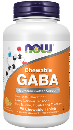 GABA (Gamma Aminobutyric Acid) is a non-protein amino acid that functions as a neurotransmitter in the human brain. GABA is known as the brain's own calming agent and is naturally produced in the body. By inhibiting over-stimulation of the brain, GABA may help promote relaxation and ease nervous tension. NOW provides only the naturally occurring form as found in food and in the body. Delicious orange flavor NOW- Chewable GABA combines this naturally occurring neurotransmitter with the amino acids Taurine and Theanine for their synergistic effects.*