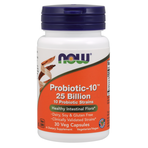 NOW® Probiotic-10™ offers a balanced spectrum of live organisms consisting of acid-resistant probiotic bacterial strains that are known to naturally colonize the human GI tract.* Probiotic bacteria are critical for healthy digestion, help maintain the integrity of the intestinal lining, support proper intestinal motility and participate in the detoxification process.* Probiotic-10™ utilizes bacterial strains that have been clinically validated for their support of healthy immune system function.*