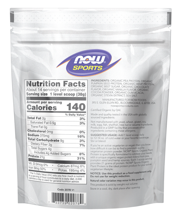 Ingredients: Organic Pea Protein, Organic Pumpkin Seed Protein, Organic Hemp Protein, Organic Beet Sugar, Organic Chocolate Flavor, Organic Vanilla Flavor, Organic Cocoa Powder, Organic Gum Acacia, Organic Stevia Extract, Sea Salt.
